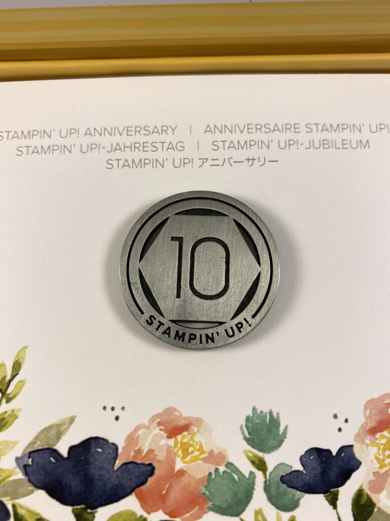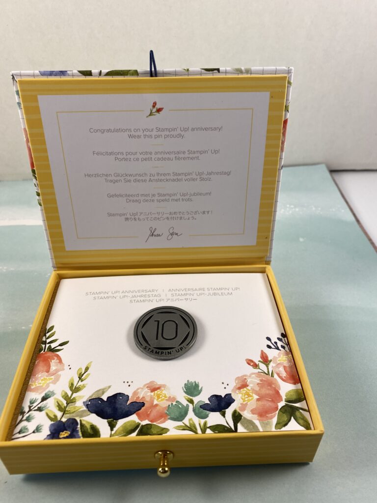 I am totally thrilled to get my 10 year pin to show off! Stampin’ Up! is the most wonderful company to work for. I have made friends locally, both demonstrators and customers, and friends from all over the world! The company’s support is extraordinary! We are a community! We are a family!